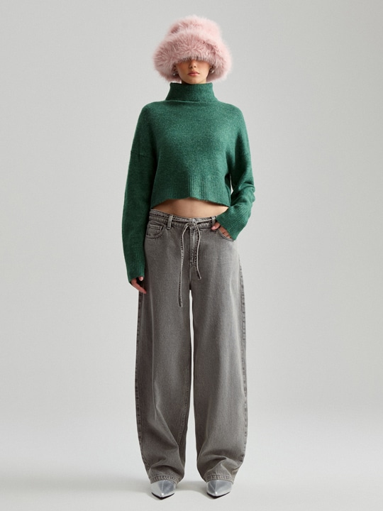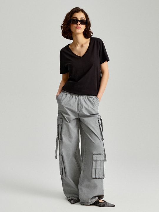 Jakie ubrania pasują do szarego koloru spodni jeansowych? Jeśli chcesz, aby Twój outfit był wart zapamiętania postaw na połączenie — szare jeansy + zielony sweter. Do tego dołóż item dla odważnych — czyli różowy kapelusz z futerkiem i możesz mieć pewność, że zostaniesz dostrzeżona! Brzmi too wild? Postaw na grzeczniejszy, ale równie spoko zestaw, na który składa się szara bluzka i różowe spodnie z szerokimi nogawkami i retro buty sportowe.
