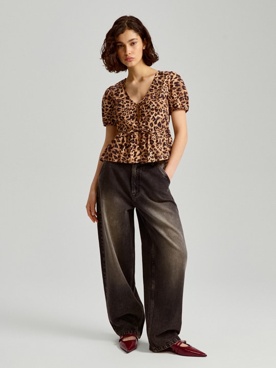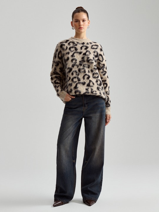 Na koniec znów trend cross. Wspomniane już wyżej szare jeansy idealnie siądą Ci do bluzki w panterkę. Będą one pasować także do pokrytego zwierzęcym motywem swetra.