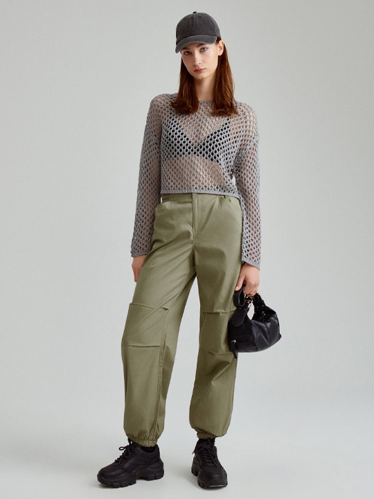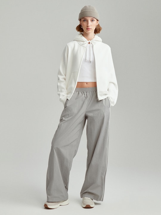 Inspirowane militarnymi klimatami, maksymalnie wygodne — tak opisać możemy viralowe spodnie parachute. Mają szerokie nogawki, a stopery pozwalają na dopasowanie ich do potrzeb sylwetki. Spodnie parachute podobnie jak wracające do łask bojówki świetnie prezentują się w warstwowych stylówkach, łączą się też z basicowymi lub przyozdobionym nadrukami koszulkami i topami.