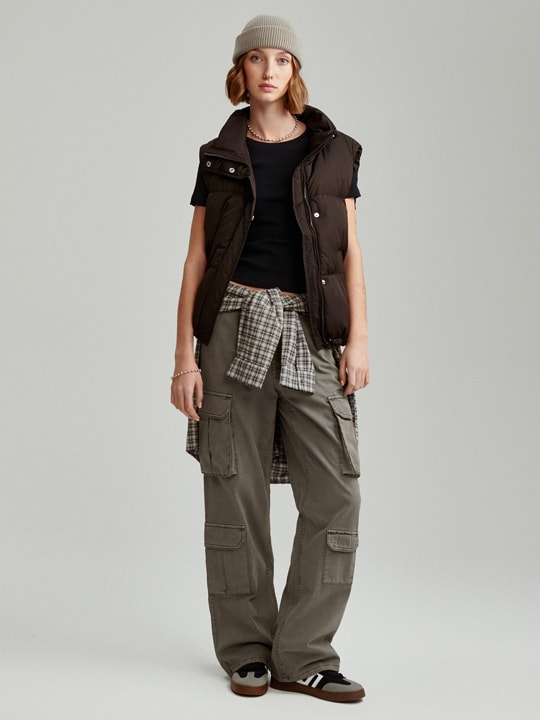 Fascynacja lookami z lat 90. i tymi w klimatach Y2k przyniosła za sobą powrót szerokich nogawek — zarówno jeśli mowa o formalnych outfitach, jak i stylówkach przeznaczonych na co dzień. Kobiety coraz chętniej wskakują w luźne spodnie — topowe rodzaje spodni damskich z prostymi, jak i rozszerzającymi się do dołu nogawkami. Bawią się proporcjami sylwetki, łącząc spodnie damskie wide leg czy straight z dopasowanymi topami i bluzkami oraz stylizowanymi na garniturowe kamizelkami, koszulkami i bluzami oversize.