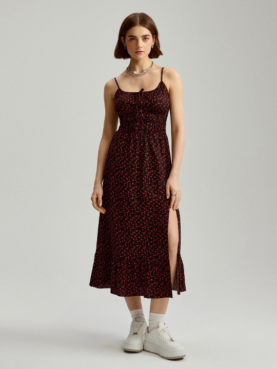 Chcesz, aby Twoja garderoba była jak najbardziej uniwersalna? 👗 Koniecznie rozejrzyj się za wykonaną z wiskozy lub bawełny sukienką w kwiaty w ciemniejszych odcieniach. Kwiatowe mieszanki czerni, brązów i różu lub czerwieni to idealne rozwiązanie nie tylko na lato 🌞. Ciemne sukienki w kwiaty jesienią 🍂 i zimą ❄️ nosić możesz wraz z rajstopami i botkami czy kozakami na platformie 👢. W House znajdziesz więc zarówno sukienki na lato w kwiaty, jak i uniwersalne modele na cały rok! 🎉