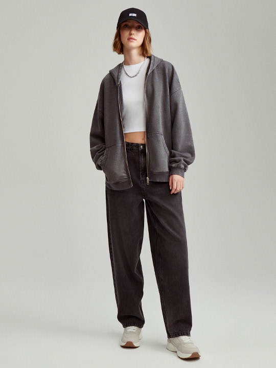 Miłośniczkom trendów polecamy szczególnie gładkie bluzy oversize z kapturem lub te z minimalistycznymi nadrukami. Bardzo dobrym wyborem będą również modele z wyhaftowanymi motywami na przodzie lub nadrukiem na plecach. Połącz je z szerokimi jeansami i sneakersami, a stworzysz modny look w stylu lat 2000., które królują w trendach tego sezonu.