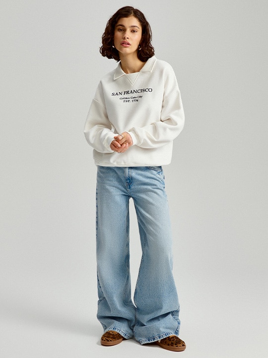 Klasyczną, a najlepiej oversizową bluzę varsity połącz jasnymi jeansami wide leg i białym t-shirtem. Dodaj sportowe buty i jesteś gotowa na dzień w szkole, na uczelni lub przelot po mieście with your besties! Taki outfit jest przede wszystkim megawygodny. Jeansy możesz zastąpić też szerokimi dresami — Yup! „It is time”, aby odłożyć joggery na półkę! 🦋