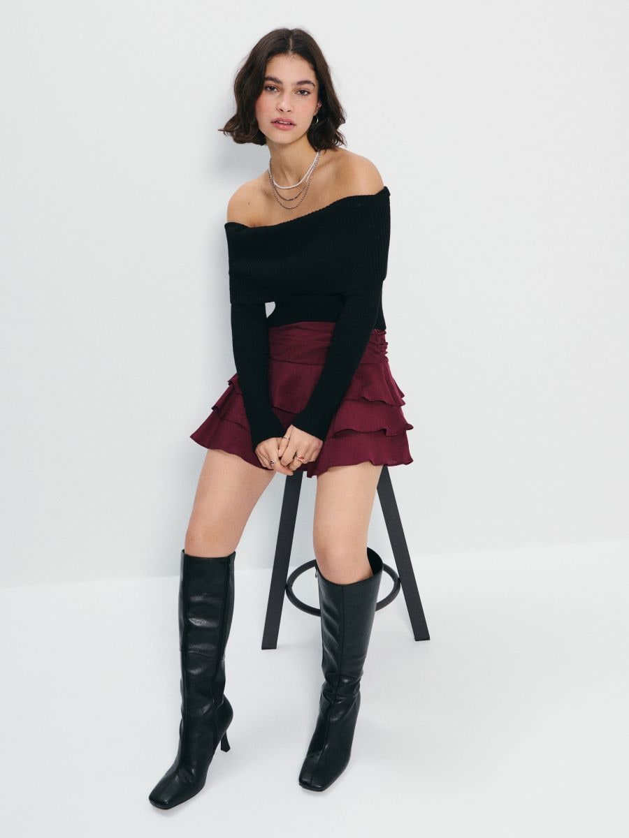 Bordowe spódnico-spodenki z falbankami i modalem w składzie