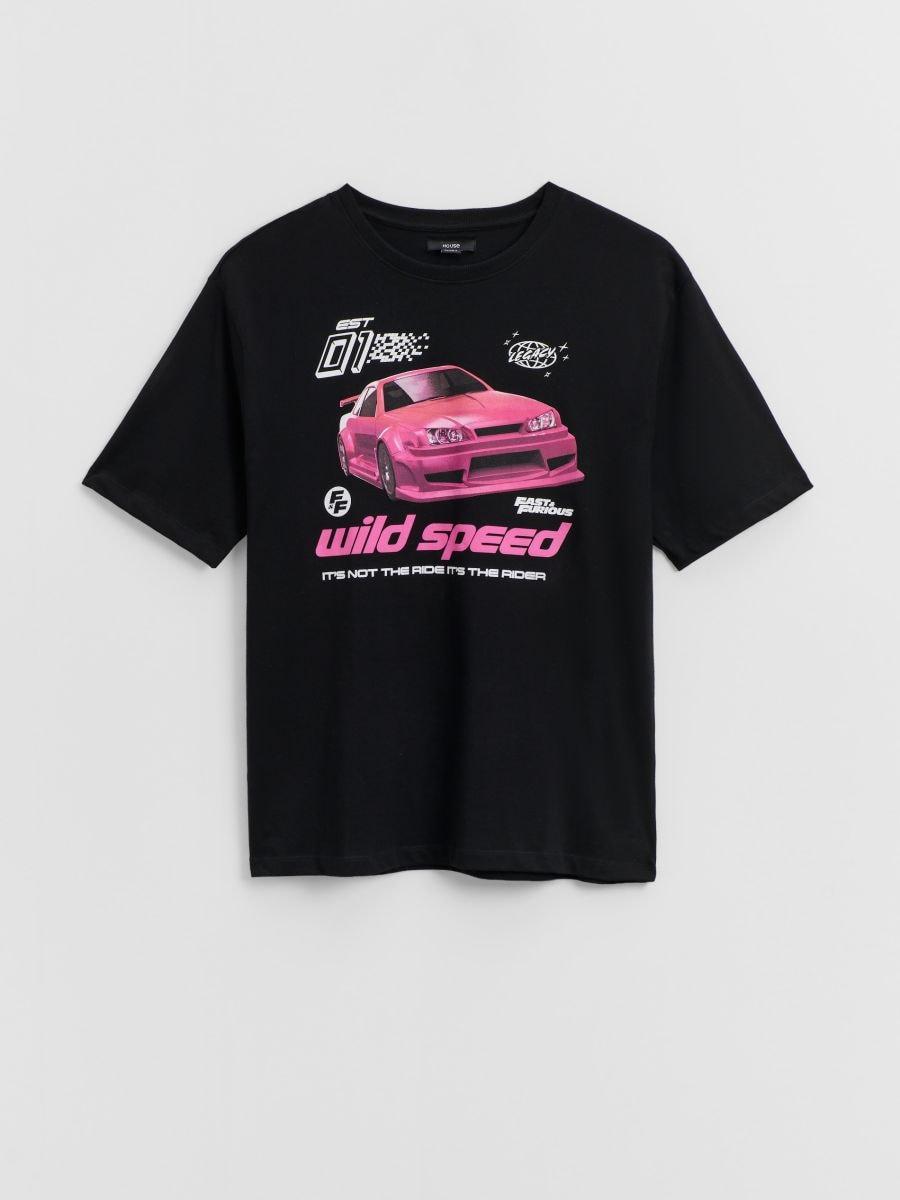 Czarna koszulka z nadrukiem rózowego samochodu