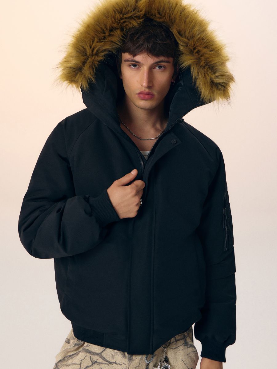 Czarna kurtka zimowa z kapturem wykończonym sztucznym futerkiem