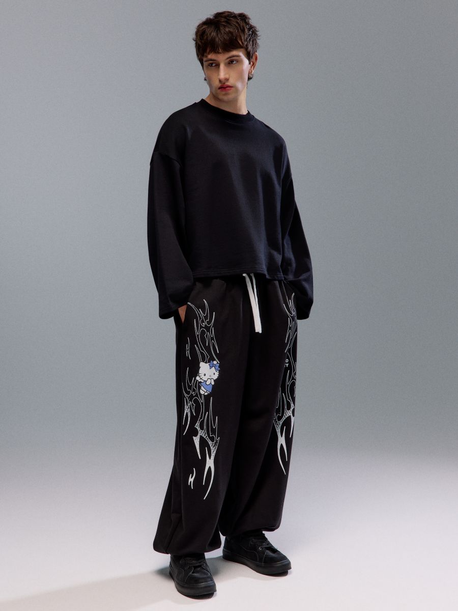 Czarne spodnie dresowe baggy fit z nadrukiem tribal i Hello Kitty