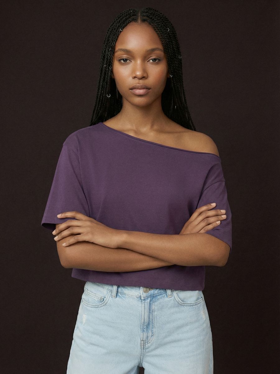Krótka koszulka z asymetrycznym dekoltem ciemnofioletowa