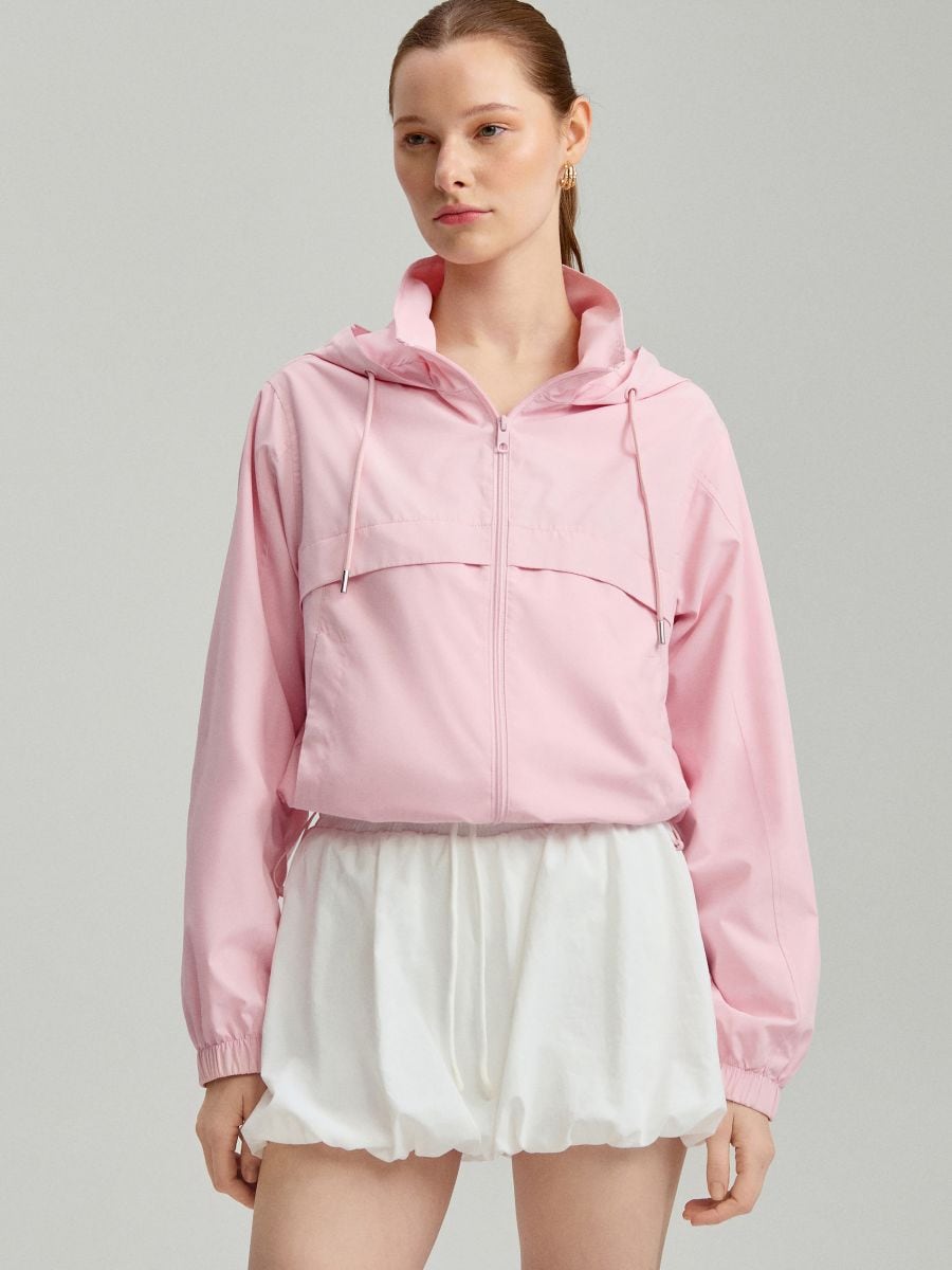 Krótka kurtka z kapturem i stójkowym kołnierzem różowa