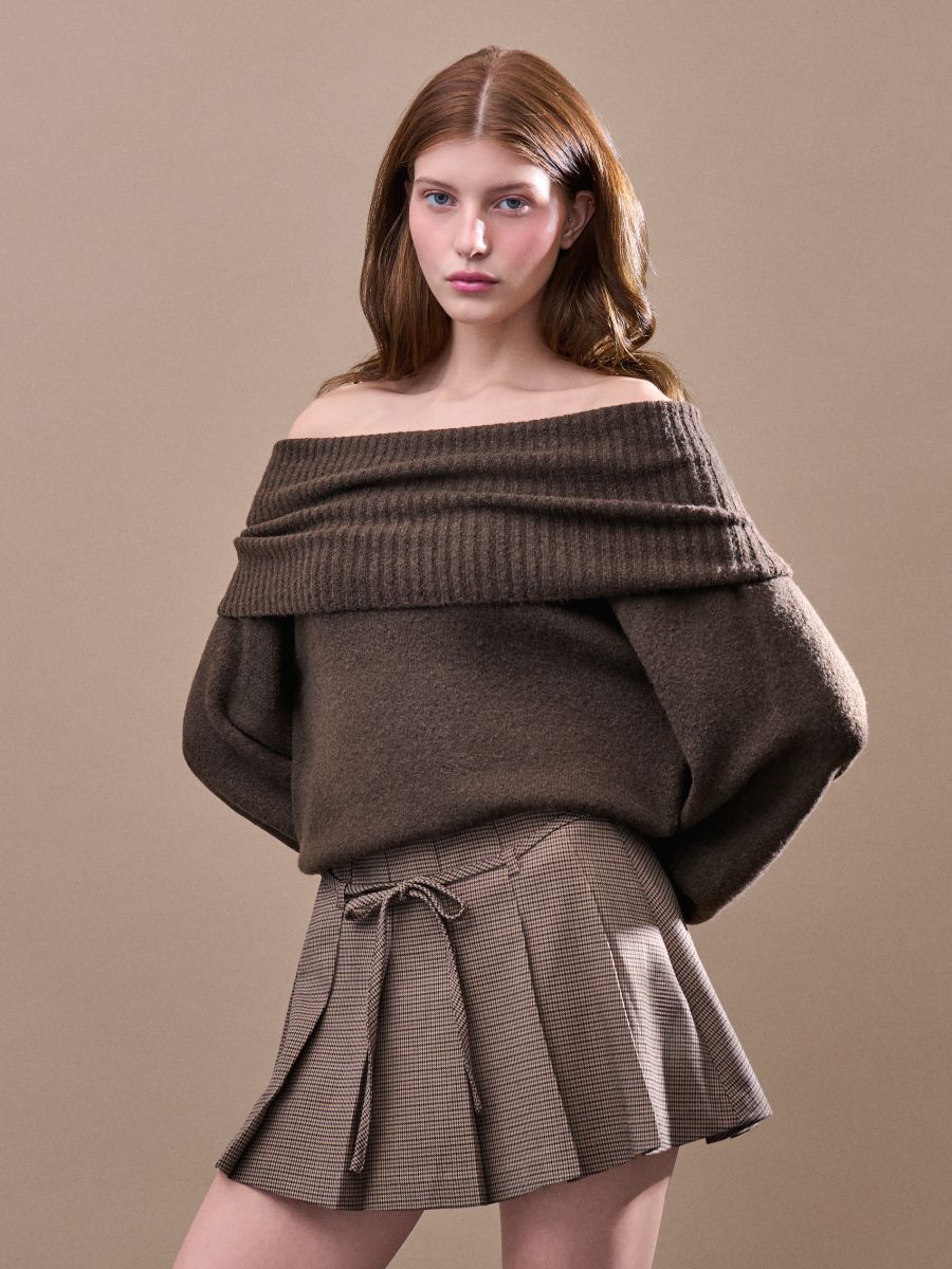Luźny sweter open shoulder z domieszką wełny w składzie czekoladowy