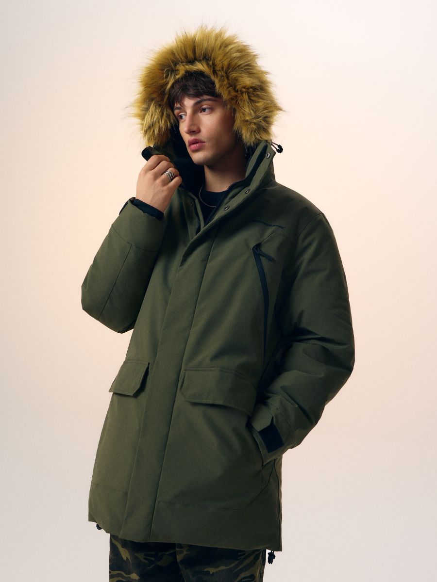 Oliwkowy płaszcz z kapturem ze sztucznym futerkiem