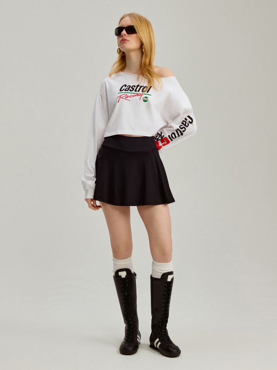 Rozkloszowana czarna spódniczka mini z wszytymi spodenkami