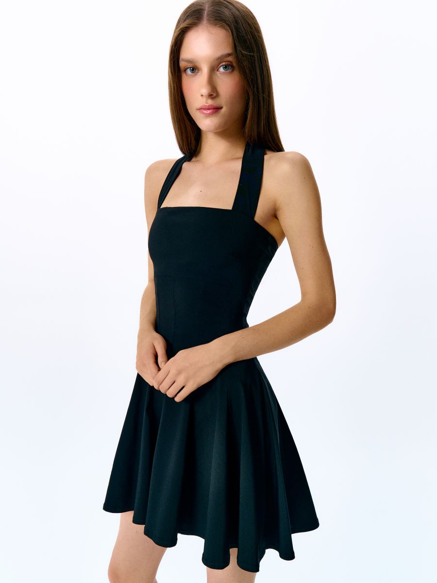 Rozkloszowana czarna sukienka mini z odkrytymi plecami